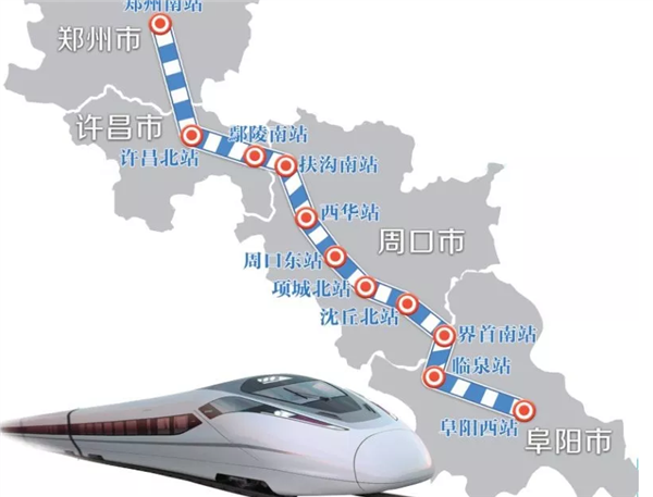 郑州至周口至阜阳铁路位于河南、安徽境内,线路经由郑州市、许昌市、周口市、阜阳市,阜阳以东接商合杭铁路至合肥枢纽。郑阜高铁设计行车速度350公里/小时,线路全长267.195公里,总投资376.4亿元,安徽段即阜阳段正线全长65.671公里,投资概算103.56亿元。新建界首南站1万平方米、临泉站1.5万平方米,为线侧式站房。