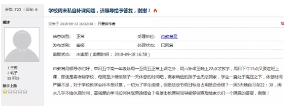 市教育局领导你们好,阜阳五中高一年级除周一至周五正常上课之外,周六补课至晚上22点才放学,周日下午15点又要进班上课。即使是寄宿制学校,每周至少留给孩子一天休息的时间吧,离家稍远的孩子也无法回家。学生一直处于高压之下,休息时间严重不足,对于学校教学安排本是好意,一切为了学生成绩,但是法定节假日私自占用是否合理?一周5天晚自习至22:30,周末几乎不给休息时间,高强度的学习如何体现劳逸结合?希望市教育局领导能够调查后给家长们一个满意的答复,谢谢!