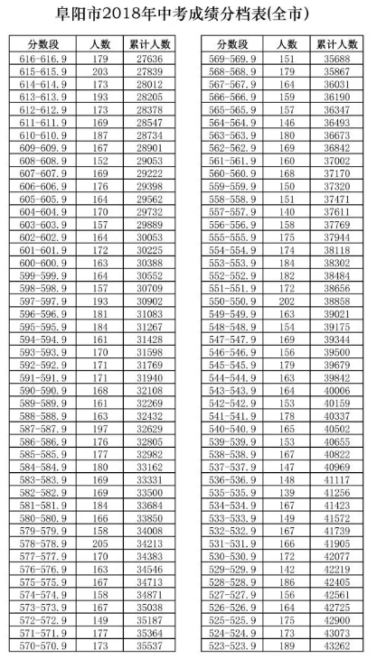 阜阳市2018年中考成绩分档表、普通高中招生建档线出炉