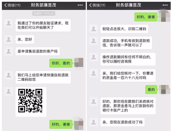 于是,程先生按照对方要求,用微信添加了一个叫“财务部廉昱茂”的人为好友,对方要求程先生识别二维码,申请自动退款。