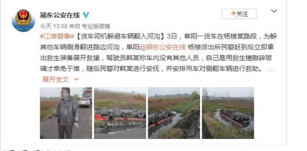 12月3日,阜阳一货车在杨楼某路段,为躲其他车辆侧滑翻进路边河沟,阜阳杨楼派出所民警赶到现场后立即拿出救生装备展开救援驾驶员韩某称车内没有其他人员,自己是用救生锤敲碎玻璃才幸免于难,随后民警对韩某进行